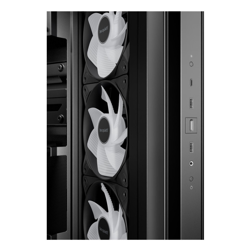 Light Base 500 LX Black features 4 preinstalled Light Wings LX fans. The rear fan is a Light Wings LX 120mm, the fans on the side are Light Wings LX 120mm PWM fans with reversed fan blades. All fans feature 16 LEDs inside their hub of the impeller, making for an unmistakable ARGB illumination. The reversed fan blades make sure that their pretty side is visible at all times.