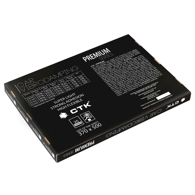 CTK Premium, to jeden z najbardziej zaawansowanych na rynku samoklejący materiał antywibracyjny wykonany na bazie najnowocześniejszego kompozytu wysokogatunkowej gumy butylowej, specjalistycznych polimerów oraz wzmacniającej przetłaczanej folii z czernionego aluminium o grubości 100 mikrometrów (0,1 mm), dodatkowo poprawiającej właściwości akustyczne. Materiał ten charakteryzuje się bardzo wysoką skutecznością tłumienia (pochłaniania) drgań w szerokim zakresie temperatur, dużą elastycznością montażową oraz bardzo wysoką lepkością i przyczepnością do podłoża. Jednocześnie, w porównywalnym przedziale grubości i skuteczności tłumienia drgań (współczynnik MLF), maty tłumiące CTK Premium są jednym z najlżejszych tego rodzaju materiałem antywibracyjnym produkowanym w Europie. Sprawia to, że stosując cieńsze, przez co też lżejsze maty CTK z serii Premium, można uzyskać redukcję wibracji i hałasu na poziomie, jaki byłby możliwy do osiągnięcia przy zastosowaniu innych, mniej zaawansowanych technologicznie materiałów o dużo większej grubości oraz znacznie wyższej wadze. Seria CTK Premium, to również oferta produktów o najszerszym na rynku zakresie dostępnych grubości (1,8/2,2/3,0/4,0mm). To ważny element podczas planowania i wykonywania profesjonalnych instalacji wyciszających pojazdy. Poprzez odpowiedni dobór grubości mat do ich zastosowania w konkretnym miejscu pojazdu, można najbardziej efektywnie wykorzystać właściwości materiału tłumiącego bez zbędnego podnoszenia wagi całej instalacji. Dzięki temu, unikna się niepotrzebnego dociążania grubszą matą mniej ważnych pod kątem akustycznym elementów pojazdu, jednocześnie aplikując najskuteczniejsze, grubsze produkty w najbardziej kluczowych i najważniejszych pod względem redukcji hałasu obszarach nadwozia samochodu. Materiały wibroakustyczne CTK z serii Premium, to bezkompromisowe produkty dedykowane przede wszystkim dla profesjonalnych instalatorów sprzętu car audio oraz renomowanych firm wyciszających pojazdy najbardziej wymagającym klientom, którzy skłonni są zapłacić nieco więcej za najwyższą skuteczność, jakość i komfort.