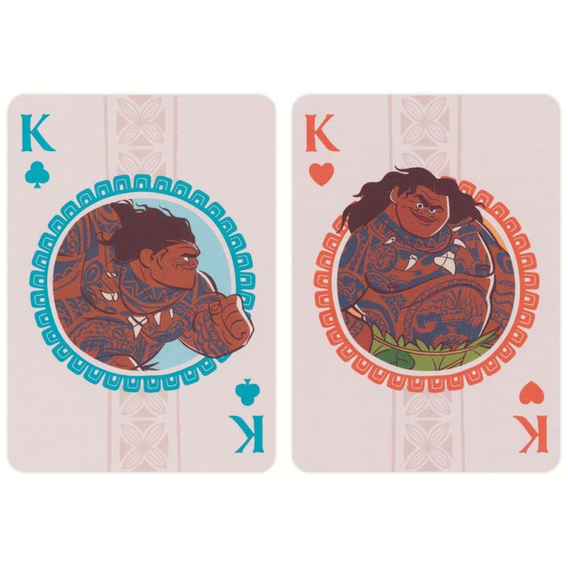 Disney Moana themed playing cards with special illustrations depicting characters such as Moana and Maui. The set includes 52 cards, 2 jokers, made of high-quality Bicycle card stock with an Air-Cushion finish.