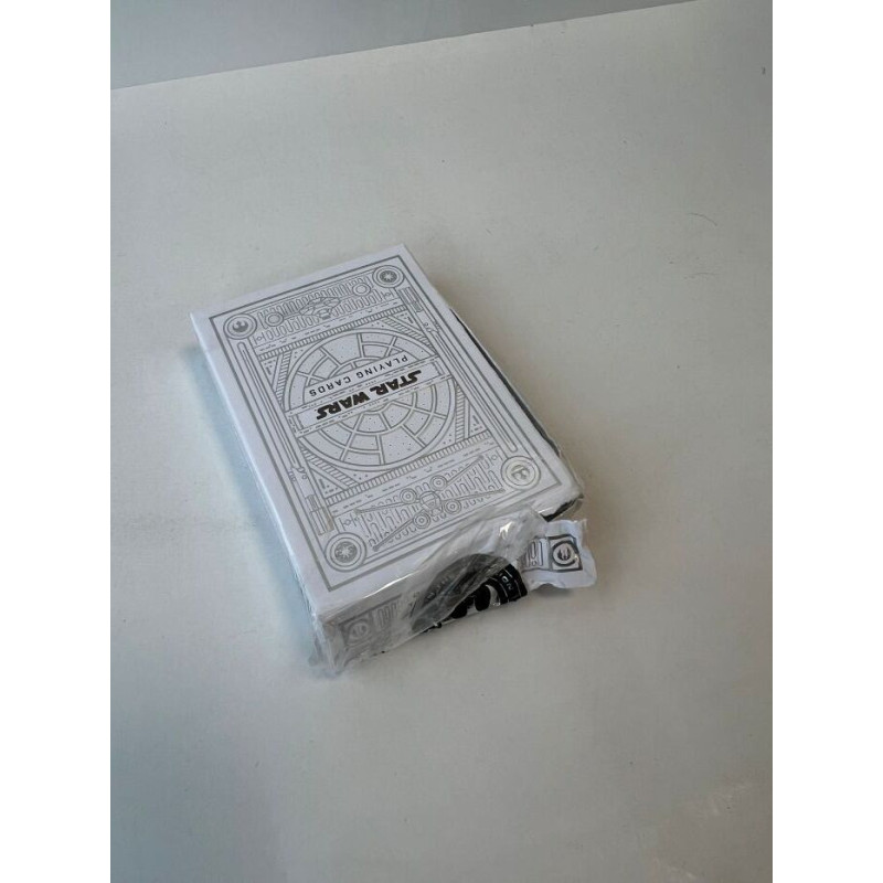 The 'Star Wars Silver Light Theory11' playing cards include 52 cards and 2 bipods, measuring 63.5 x 88.9 mm. The cards are made of plastic-coated paper with an air cushion finish, making them perfect for poker and card tricks.