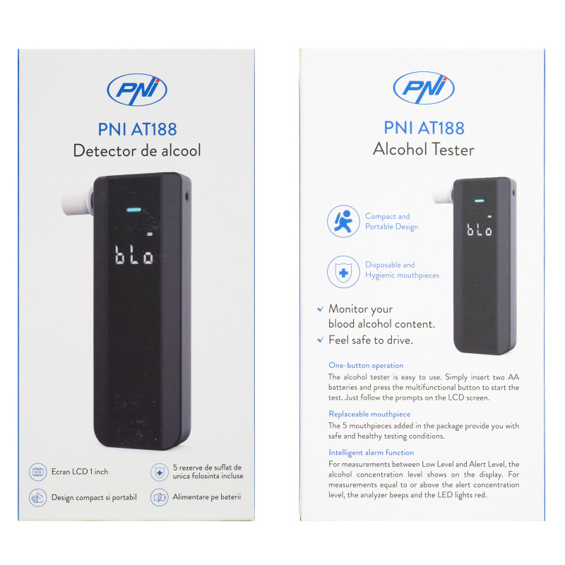 PNI AT188 is a portable alcohol detector with LCD screen, which announces by a sound and light signal the exceeding of the set alcohol concentration.