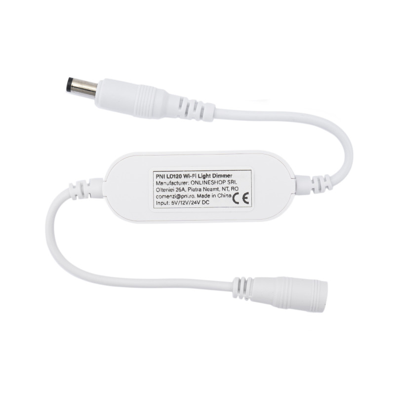 PNI LD120 smart dimmer with WiFi, control via the Tuya Smart application, 5V/12V/24V DC power supply for a maximum power of 72W. Compatible with dimmable lighting sources (clear specification from the factory): LED strips, LED lighting fixtures, 5V/12V/24V DC LED bulbs maximum 72W.