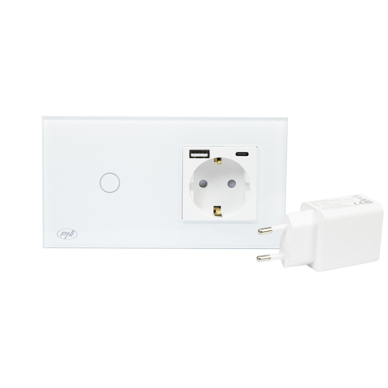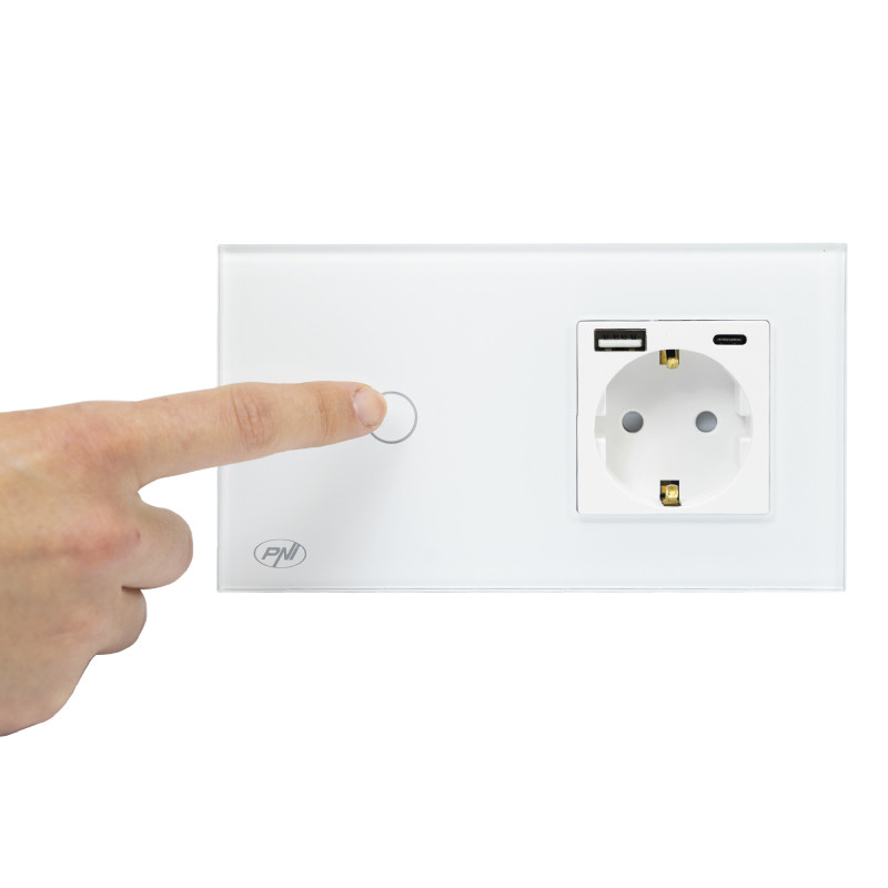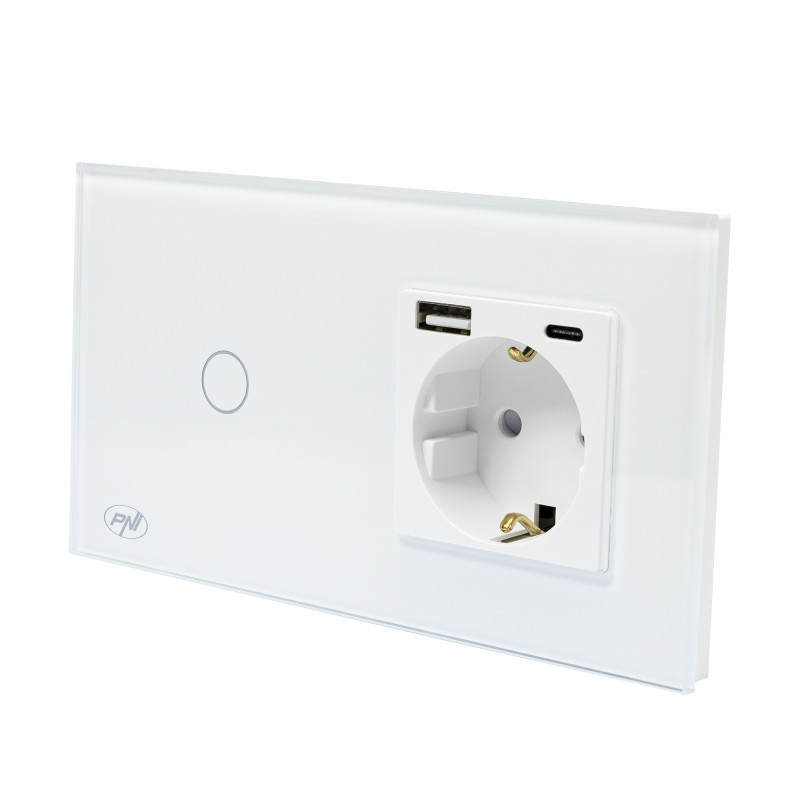 PNI SH115W simple glass switch with touch, combined with Schuko socket and USB plugs