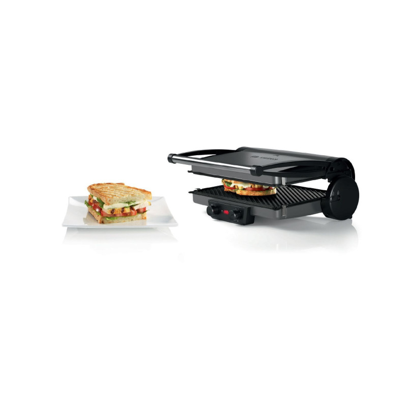 This contact grill features a powerful 2000W heating element and an adjustable thermostat, ensuring precise temperature control for perfect cooking results every time.