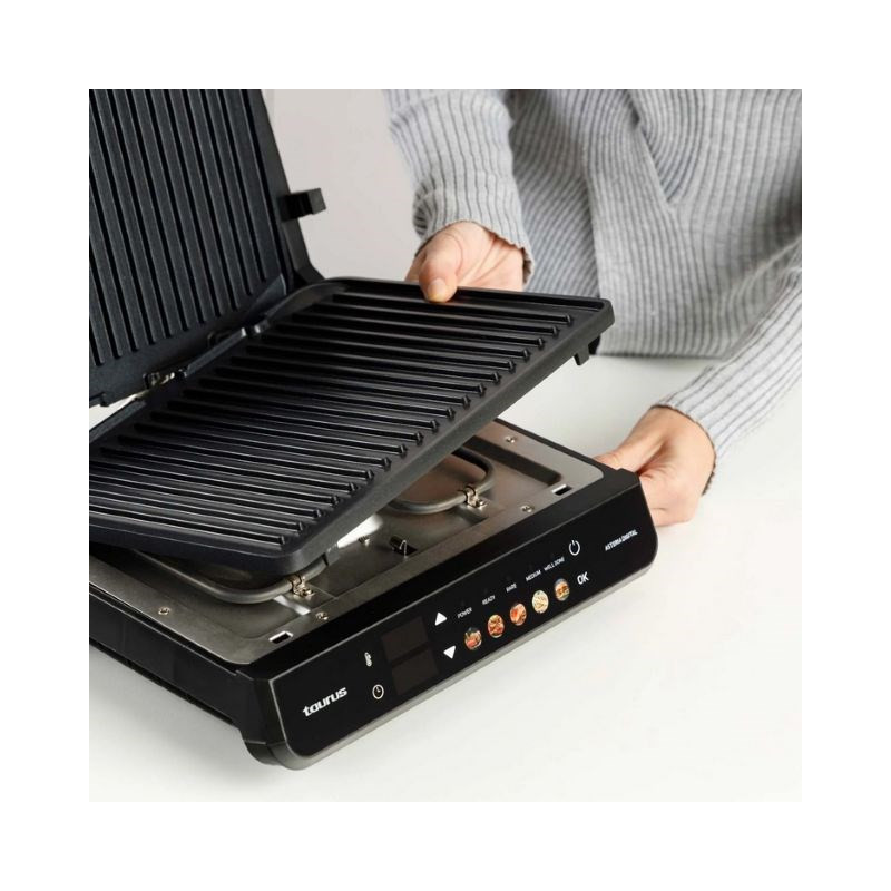 The Taurus Asteria Digital 2-in-1 electric grill has an adjustable thermostat and a non-stick coating for easy cooking and cleaning. With 2000 W of power and a removable fat collection tray, it brings convenience to the kitchen.