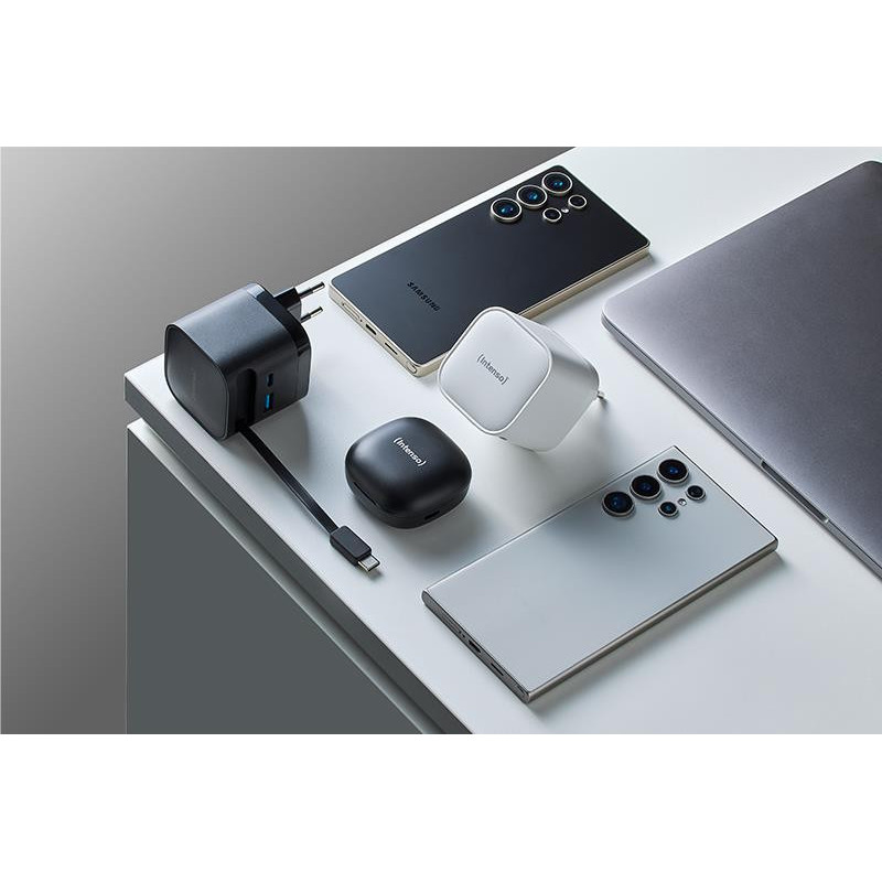 The Intenso Power Adapter W65ACIC GaN is the ideal solution for fast and efficient charging of modern devices. With a maximum output of 65 W, it supports Power Delivery 3.0, PPS, and Quick Charge 4.0 - perfect for smartphones, tablets, or laptops. Thanks to the integrated retractable USB-C cable and additional USB-C and USB-A ports, multiple devices can be charged simultaneously at maximum speed.