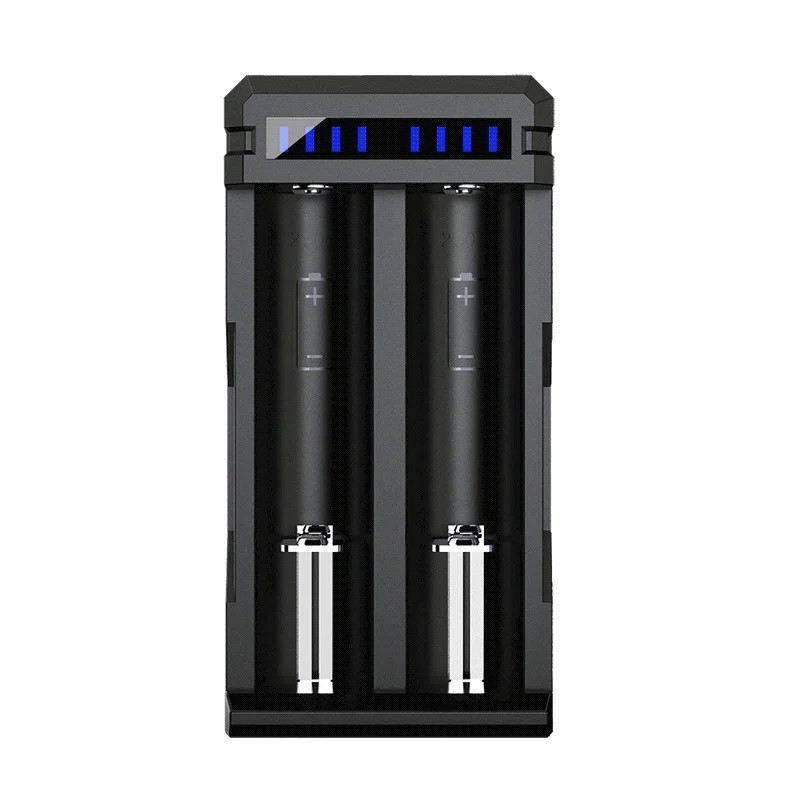 This charger, compatible with 18650 lithium-ion batteries, has two slots and is powered via USB-C. It features LED indicators to show charging and readiness status, and also includes a USB-C to USB cable.