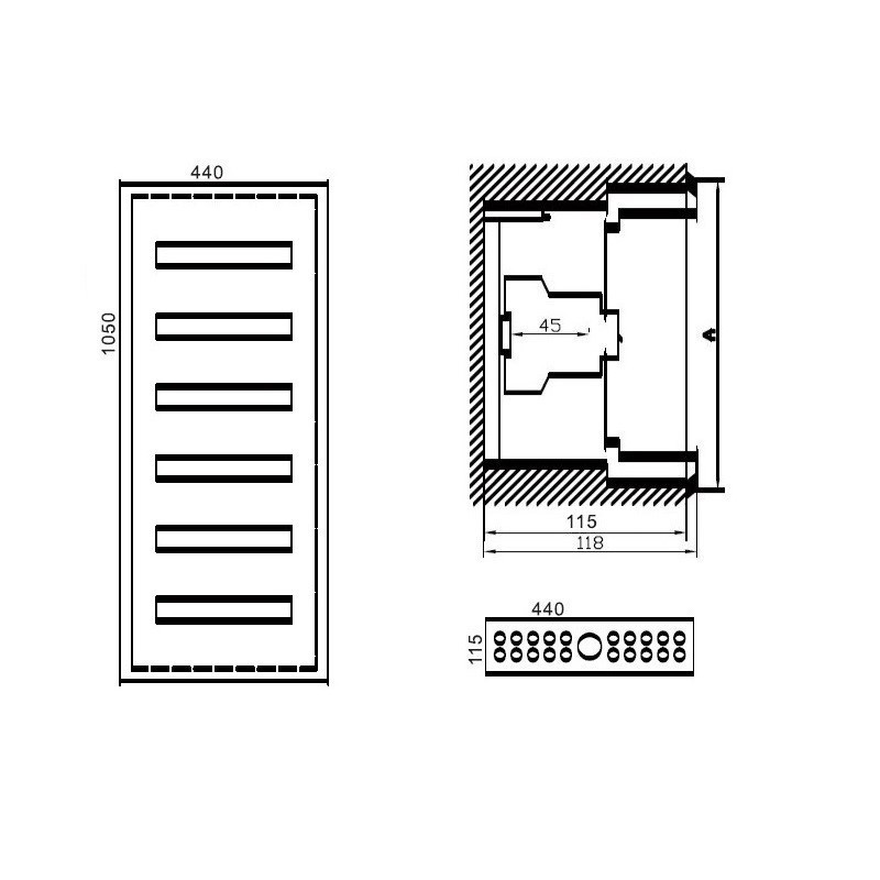 Distribution panel 440x1050x115mm, 6 DIN x16P, flush-mounted, metal, IP54. Flush-mounted metal distribution box with 6 DIN rails specially designed for the installation of circuit breakers. Features: