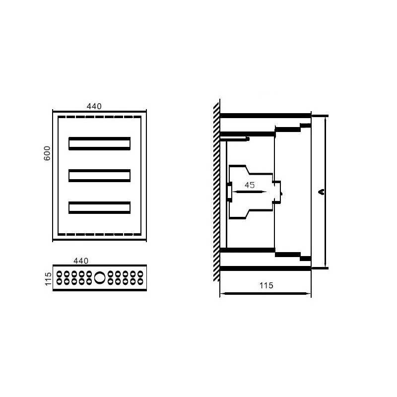 Distribution panel 440x600x115mm, 3 DIN x16P, surface-mounted, metal, IP54. Surface-mounted metal distribution box with 3 DIN rails specially designed for the installation of circuit breakers. Features: