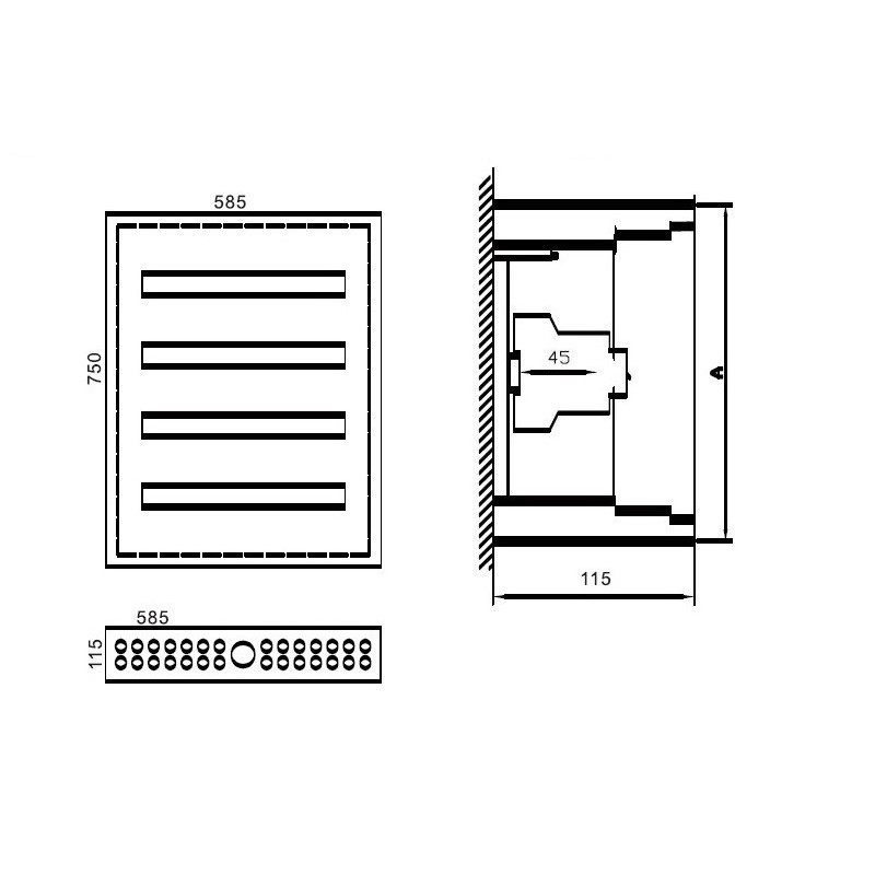Distribution panel 585x750x115mm, 4 DIN x24P, surface-mounted, metal, IP54. Surface-mounted metal distribution box with 4 DIN rails specially designed for the installation of circuit breakers. Features: