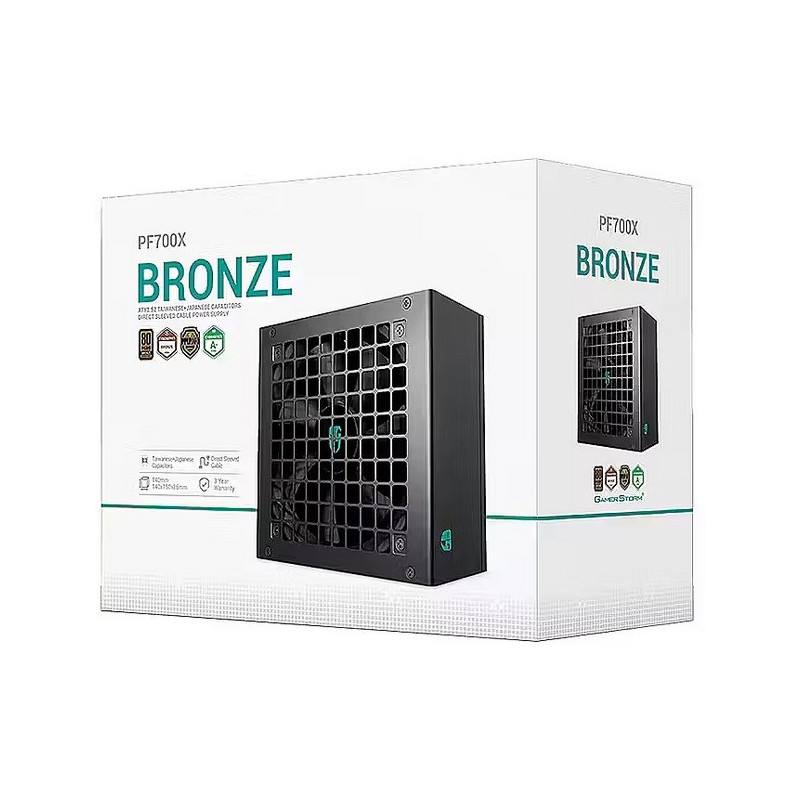 The DeepCool PF700X power supply delivers 700W of power with active cooling and a single 12cm fan. It features multiple protections, including short-circuit and overload protection, as well as various switches for peripherals and motherboards.
