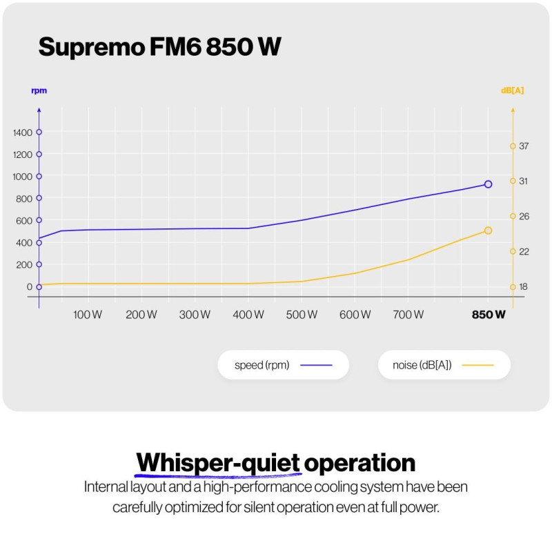 Supremo FM6 850 W has been designed with maximum user comfort in mind. Thanks to the optimized component setup streamlining the air flow and a high-performance cooling system, the PSU runs exceptionally quietly and retains low temperature even under full load.