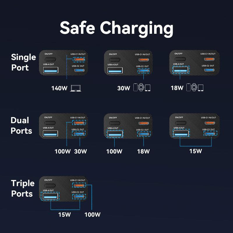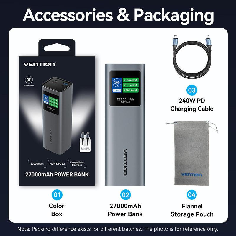 | Summary | Vention 27000mAh Power Bank 140W. Battery capacity: 27000 mAh, Fast charging technology: Adaptive Fast Charging, Power Delivery 3.0, Power Delivery 3.1, Quick Charge 3.0, Battery voltage: 22.2 V. USB Type-A output ports: 1, USB Type-C ports quantity: 2. Total output power: 140 W. Product colour: Grey |
