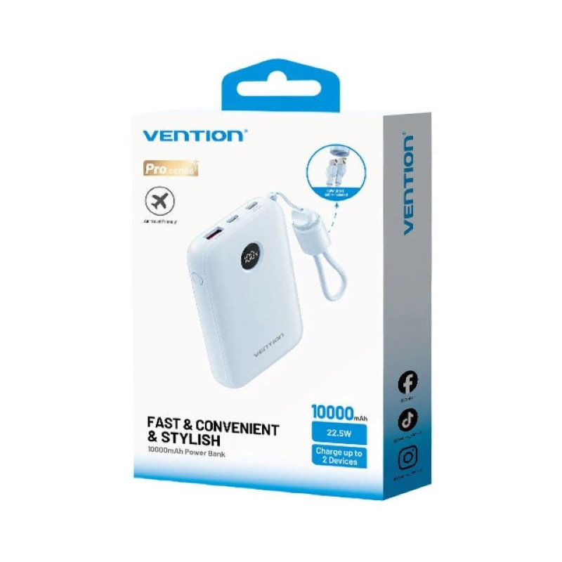 The Vention 10000mAh Powerbank has two USB Type-C ports and one USB Type-A port, providing a total output of 22.5W for charging devices. It features LED indicators to show charging status, and is compact, measuring 104mm high, 69mm wide, and 19.6mm deep, with a weight of 198g.
