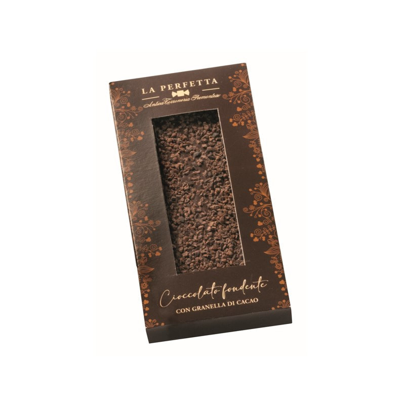 Dark chocolate with cocoa bean pieces, packaged in a sturdy cardboard box.
