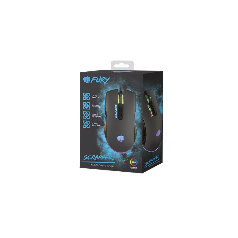The FURY Scrapper mouse features an ambidextrous design, a 6400 DPI optical sensor, and 5 programmable buttons. It has a 1.6m cable, multi-color lighting, and is compatible with a variety of operating systems, including Windows and Linux.