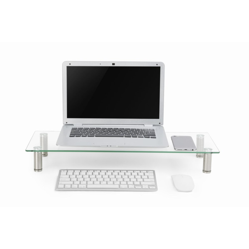 Gembird MS-TABLE-GM-01 is a medium-sized monitor stand made of steel and tempered glass, capable of supporting up to 20 kg. It measures 580 mm wide, 210 mm deep and 90 mm high, and is designed for freestanding installation on a table.
