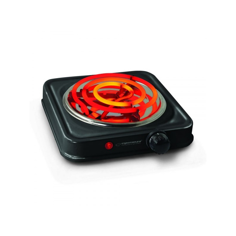 The Esperanza EKH012K stove has one 21 cm wide heating zone and a power of 1000 W. It features a stepless temperature regulator with five power levels and a rotary control button on the front right side.
