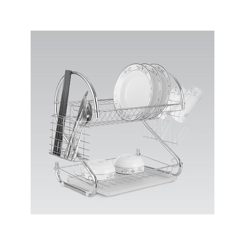 Freestanding dish drying rack with compartments for drying dishes, plates and glasses. Made of metal, has a drip tray and is 430 mm wide.