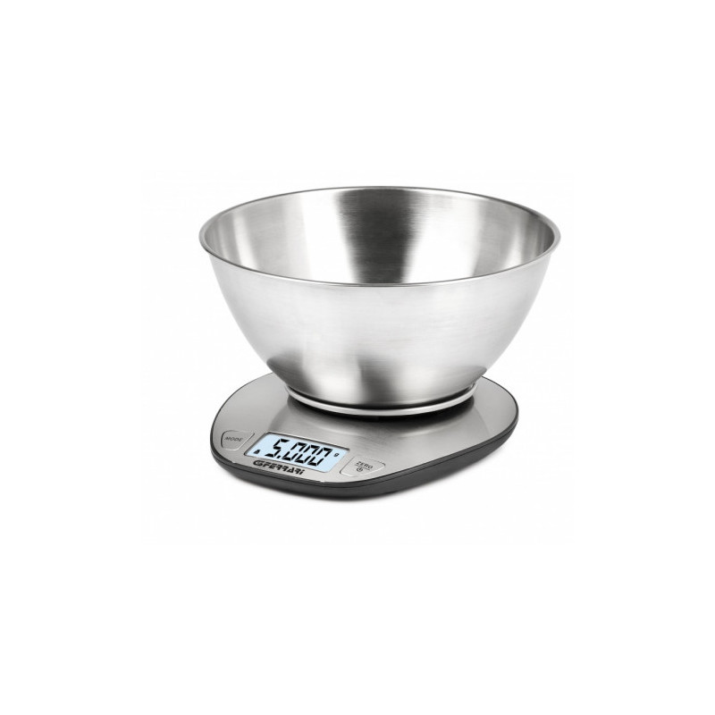 The ProfiCook KW1040 is an electronic kitchen scale with a maximum weight capacity of up to 5 kg and an accuracy of 1 g. It features a 2 L bowl, a blue LED-illuminated LCD display and a zero weight function for easy ingredient measurement.