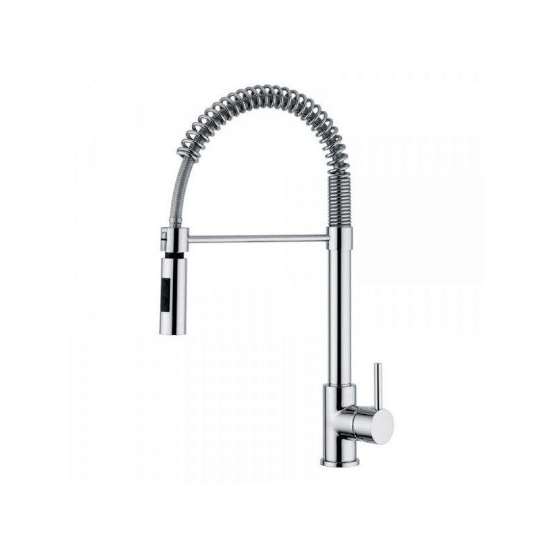 Single-lever kitchen sink mixer with pull-out spout and 360° rotation. It has a ceramic cartridge, chrome finish and requires one fixing hole for installation.
