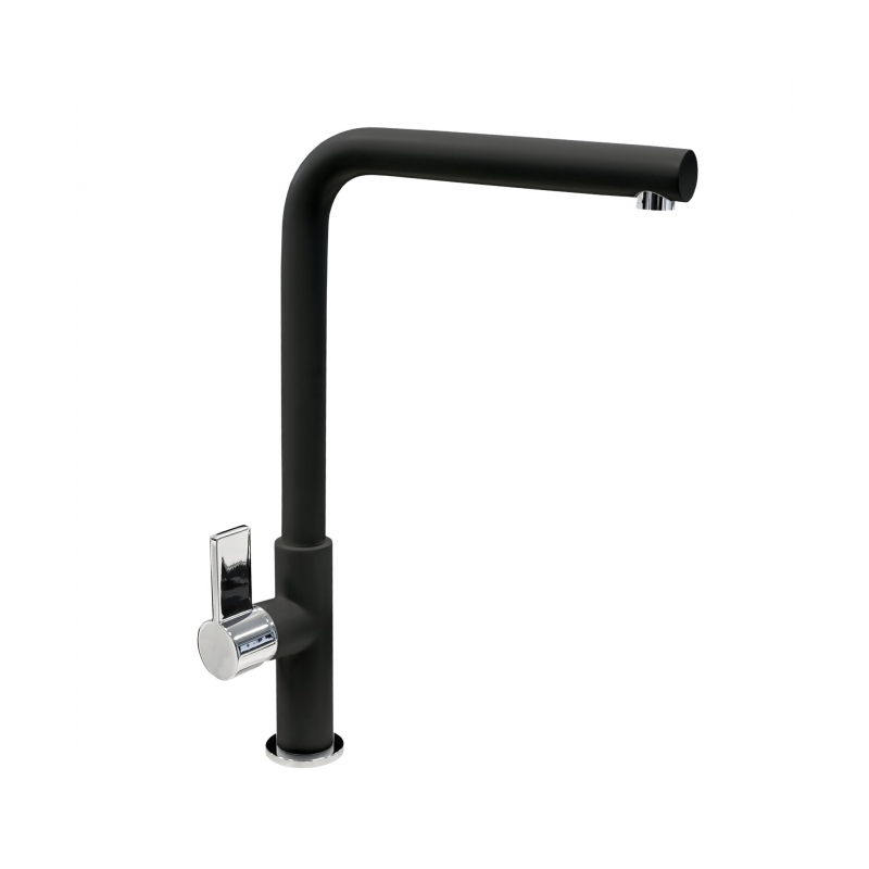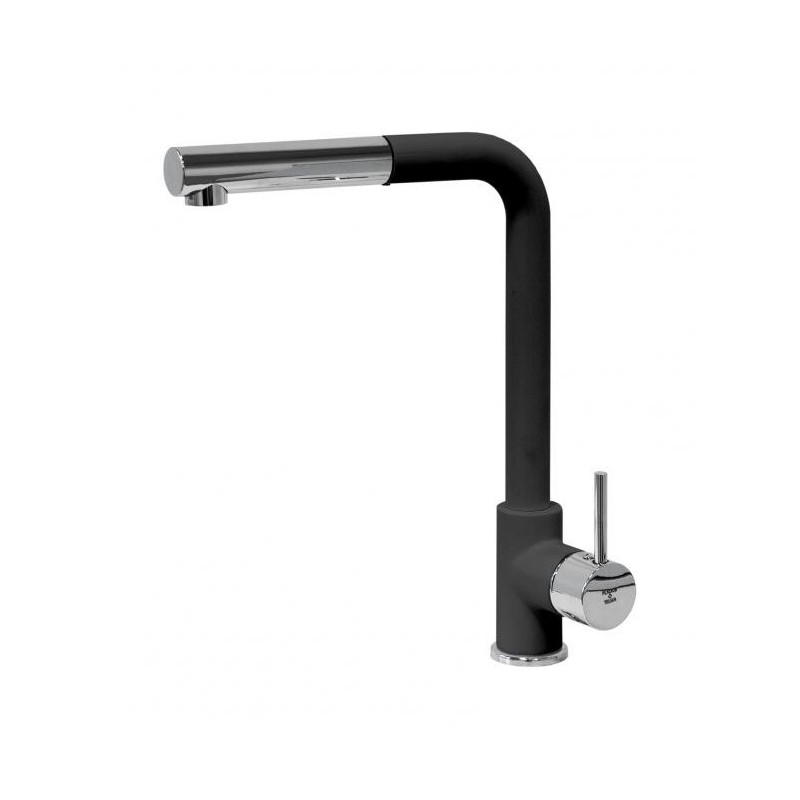 The Pyramis Silvio Duo kitchen faucet features a granite body with a chrome-plated surface and a swivel spout. It has a single-lever handle for adjusting the water flow, and all the necessary installation accessories are included.