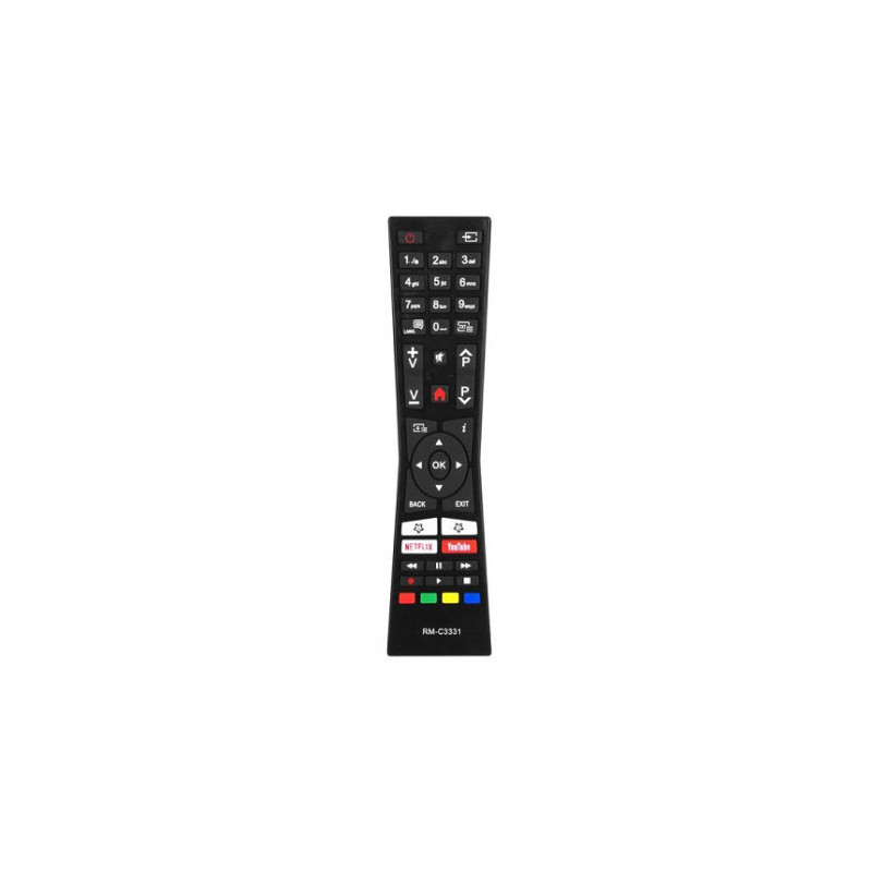 The universal remote control, compatible with TCL TVs, has 19 buttons and IR wireless connection. It requires 2 AA batteries for operation and has a 3-year warranty.
