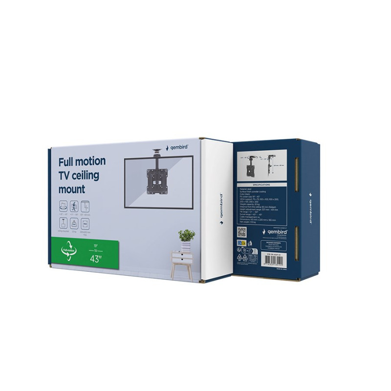 Ceiling mount for TVs from 19" to 43" with a maximum weight capacity of up to 20 kg. It features 90° tilt adjustment, a swivel range of -45° to 45°, and a cable management system.