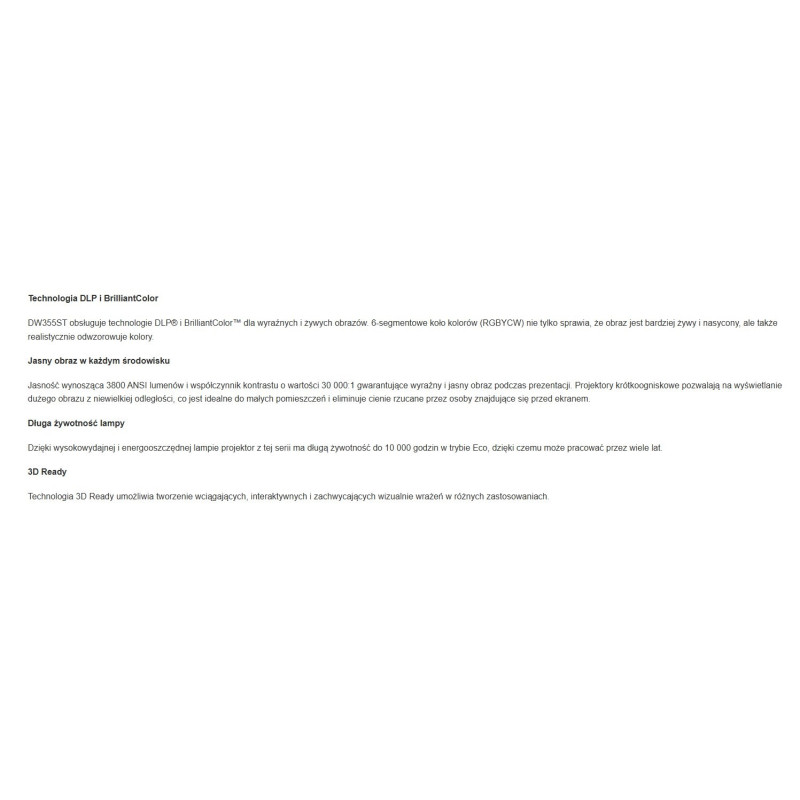 The VIVITEK SHORT-THROW PROJECTOR DW355ST is a DLP projector with a native resolution of 1280 x 800 (WXGA) and 3800 ANSI lumens of brightness. It has 40° vertical keystone correction and a light source life of up to 7000 hours in economy mode.