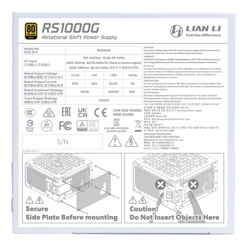 | Summary | Lian Li RS1000G. Total power: 1000 W, AC input voltage: 100 - 240 V, AC input frequency: 50/60 Hz. Motherboard power connector: 20+4 pin ATX, Motherboard power cable length: 62 cm, Peripheral (Molex) power cable length: 500 mm. Purpose: PC, Power supply unit (PSU) form factor: ATX, 80 PLUS certification: 80 PLUS Gold. Product colour: White, Fan diameter: 13.5 cm, Number of fans: 1 fan(s). Width: 86 mm, Depth: 150 mm, Height: 150 mm |