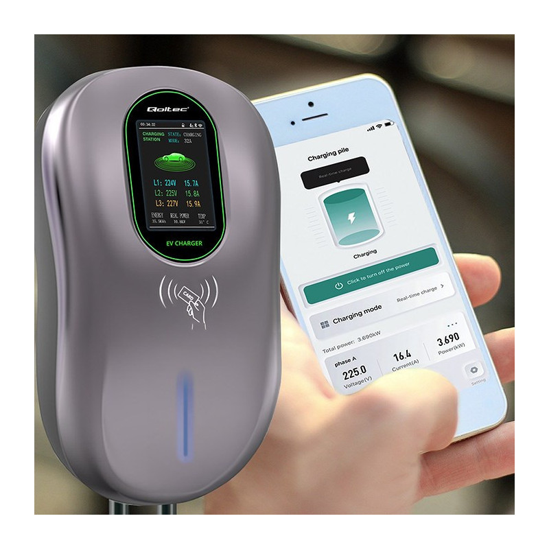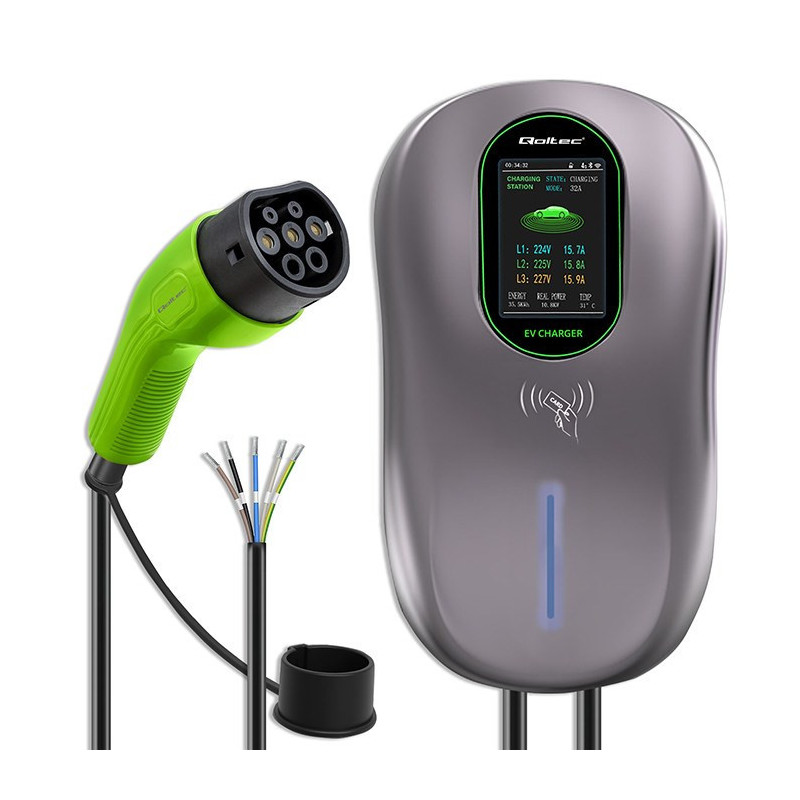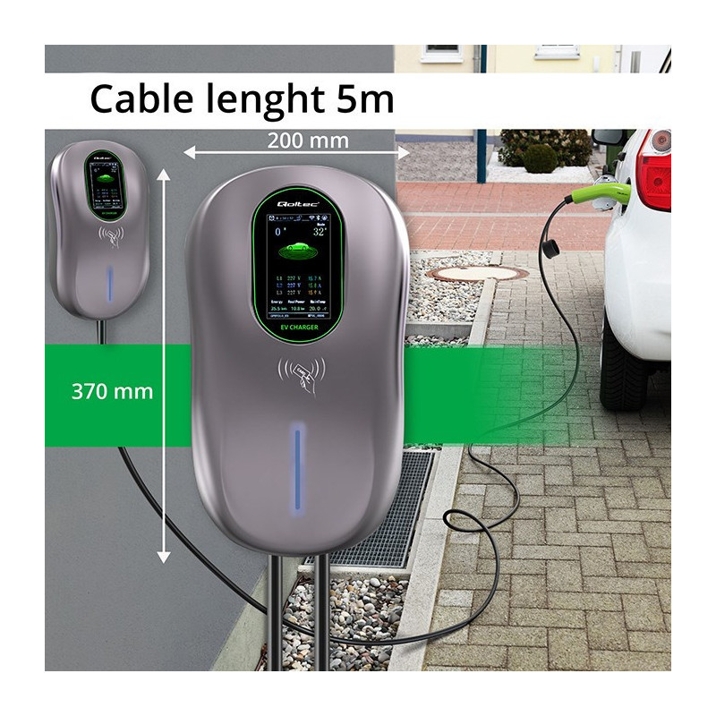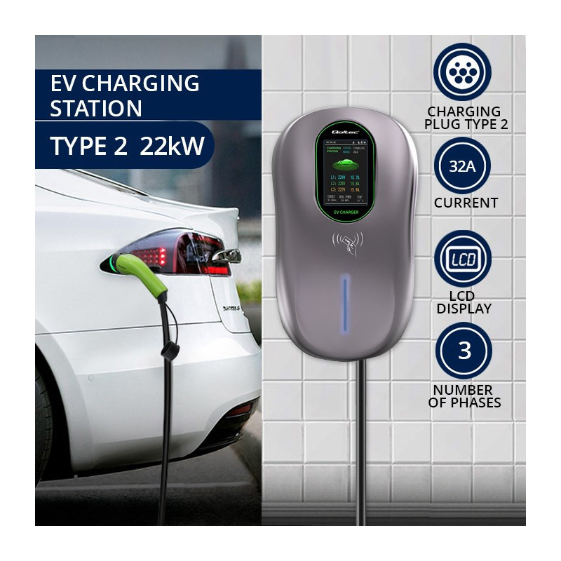 Qoltec 52430 EV Charging Station 2-in-1 Type2 | 22kW | Wi-fi| LCD | RFID | 3 phases | Wallbox | 5m