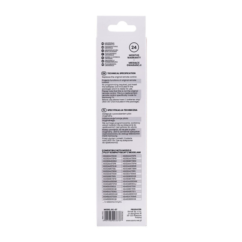 Savio RC-07 is a universal remote control specially designed for Samsung TVs, a perfect replacement for the original SAMSUNG RC-07. It provides convenient IR wireless TV control.