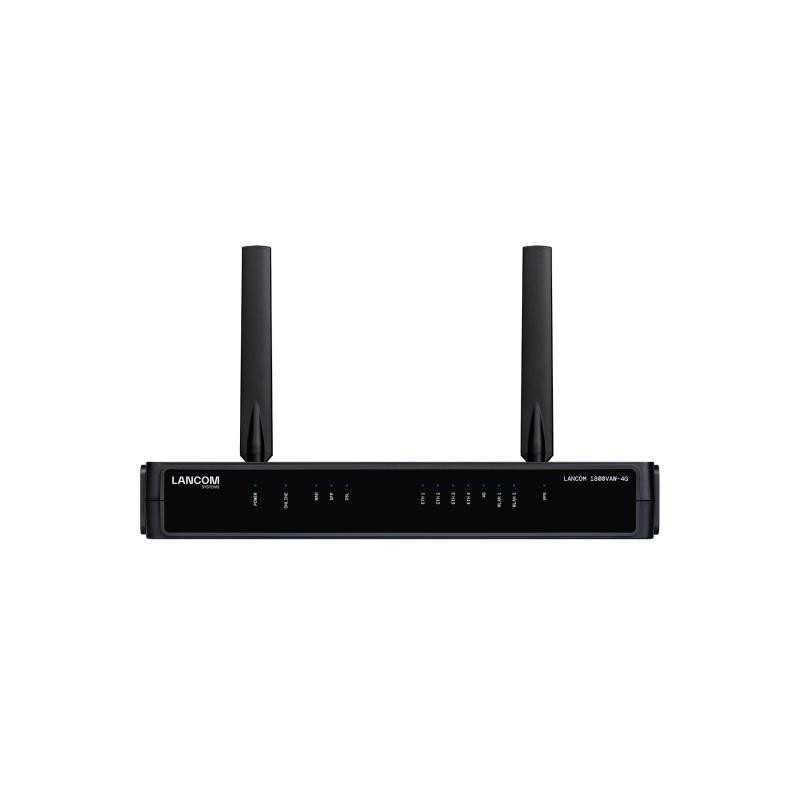 The LANCOM SD-WAN Gateway 1800VAW-4G has VDSL and 4G connectivity, supporting data transfer speeds of up to 300 Mbps. It features Wi-Fi 6 technology, allowing simultaneous use of two bands, and offers secure VPN capabilities with up to 25 channels.