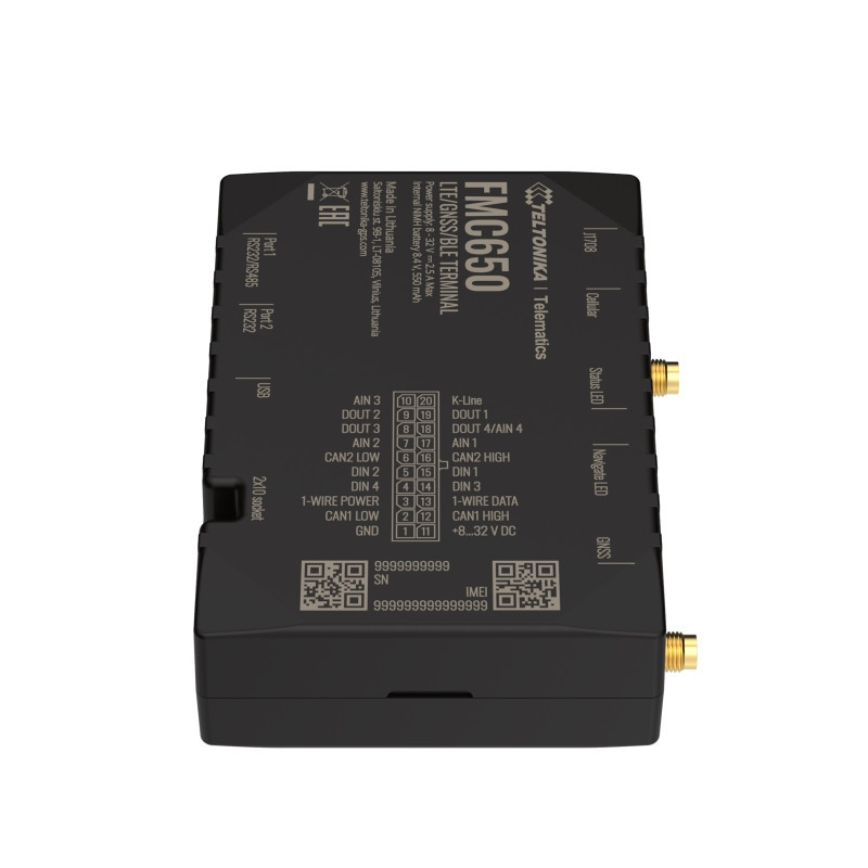 Teltonika FMC650is a direct successor to the current most popular 4GPROFESSIONALseries device -FMC640- successor. The FMC650 has 4G (LTE Cat 1) communication coverage, including 2G (GSM) backup. The device is equipped with GNSS and LTE modules, external GNSS and LTE antennas. A separate GNSS module improves tracking accuracy, making the FMC650 better suited for integration into a free-traffic electronic toll system. Compared to the FMC640 - the FMC650 has a new processor that improves the computing power of the device, and the increased internal memory allows you to customize the device for specific application needs. Switchable CAN terminators will allow you to use the device in a CAN network with many nodes. Finally, the device can be powered via USB, which simplifies the configuration process. All the functionalities supported by the FMC640 are also supported by the FMC650, so it will maximize the efficiency of your fleet with features such as FMS CAN data (J1939), fuel CAN data (J1708), tachograph live data (K-Line), remote tachograph file download, support for various third-party RS232 or RS485 devices and Dual-SIM or eSIM compatibility. The device is suitable for applications such as international logistics, refrigerated transport, agriculture, construction and mining, security and emergency services and others.
