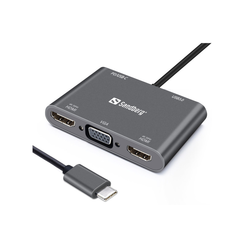 Outputs: 2xHDMI Female, USB-C female (for power supporting up to 100W), 1 x USB 3.0 A female, 1 x VGA female