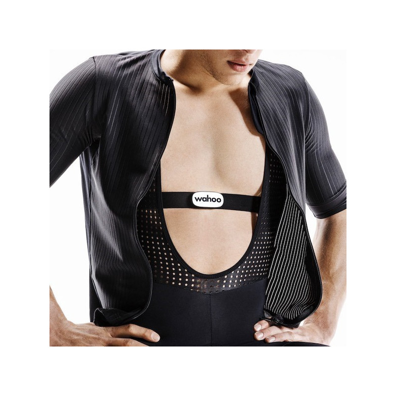 The WAHOO TRACKR heart rate monitor is a wireless device that monitors heart rate during physical activities. It has Bluetooth and ANT+ connectivity, a maximum chest circumference of 127 cm, and a battery life of up to 100 hours.