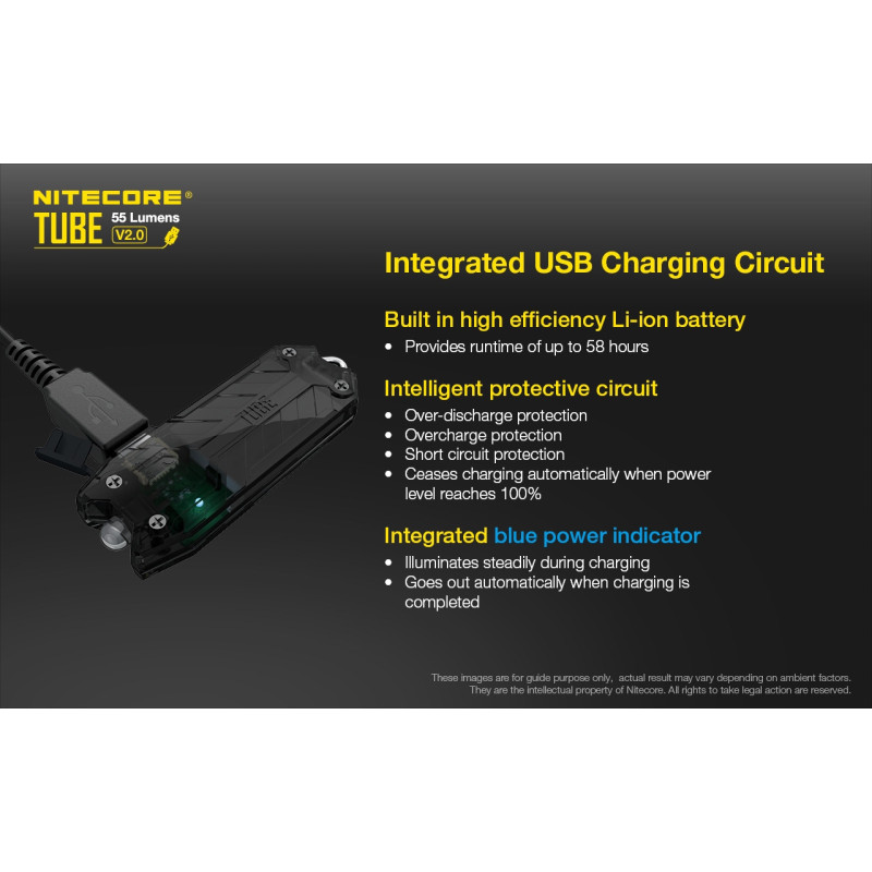 - Utilizes a high-performance LED with a max output of 55 lumens - Built-in rechargeable Li-ion battery provides a max runtime of 58 hours - Integrated intelligent Li-ion battery charging circuit (Micro-USB charging port) - Advanced Power Cut-Off (APC) technology for an ultra-low parasitic drain - Single switch offers one-hand operation - 2 brightness levels and Infinitely Variable Brightness (1-55 lumens) available - Wide range 100° flood beam - Constructed from durable PC materials - Dual metal key ring connector withstands up to 35kg (77lbs) - Extremely lightweight, compact and portable - Impact resistant to 1 meter