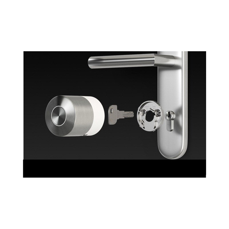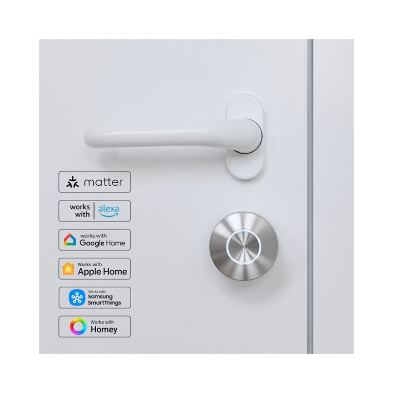 Smart keyless door lock with brushless motor. Compatible with iOS and Android, has Bluetooth connectivity and operates in a temperature range of 10 to 40 °C.