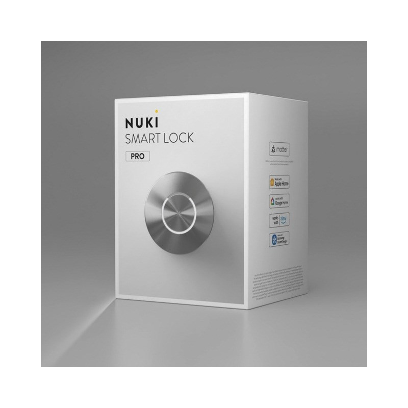 Smart door lock with wireless entry and brushless motor. Compatible with iOS and Android, has Bluetooth connectivity and operates in a temperature range of 10 - 40 °C.