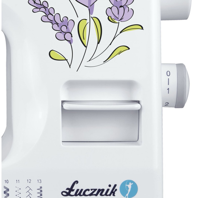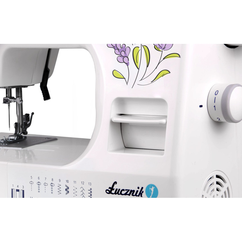 The Łucznik Weronika 2008 sewing machine offers 22 programs and 5 thread patterns, with features such as a 4-step buttonhole, adjustable thread length and width, and a built-in light. The set includes accessories such as a zipper foot, roller, and thread unwinder, and the free-hand design allows for comfortable sewing.