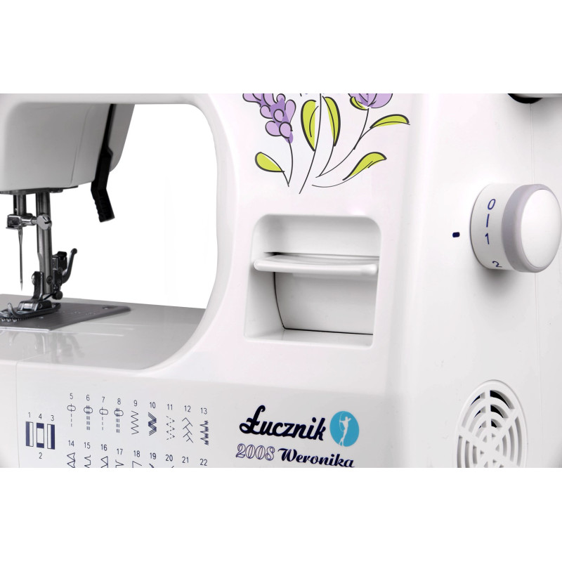 The Łucznik Weronika 2008 sewing machine offers 22 programs and 5 thread patterns, with features such as a 4-step buttonhole, adjustable thread length and width, and a built-in light. The set includes accessories such as a zipper foot, roller, and thread unwinder, and the free-hand design allows for comfortable sewing.