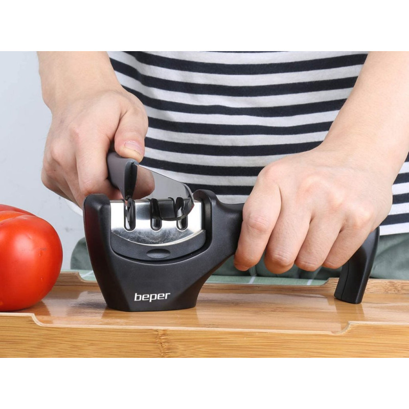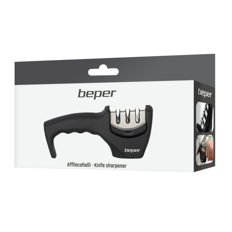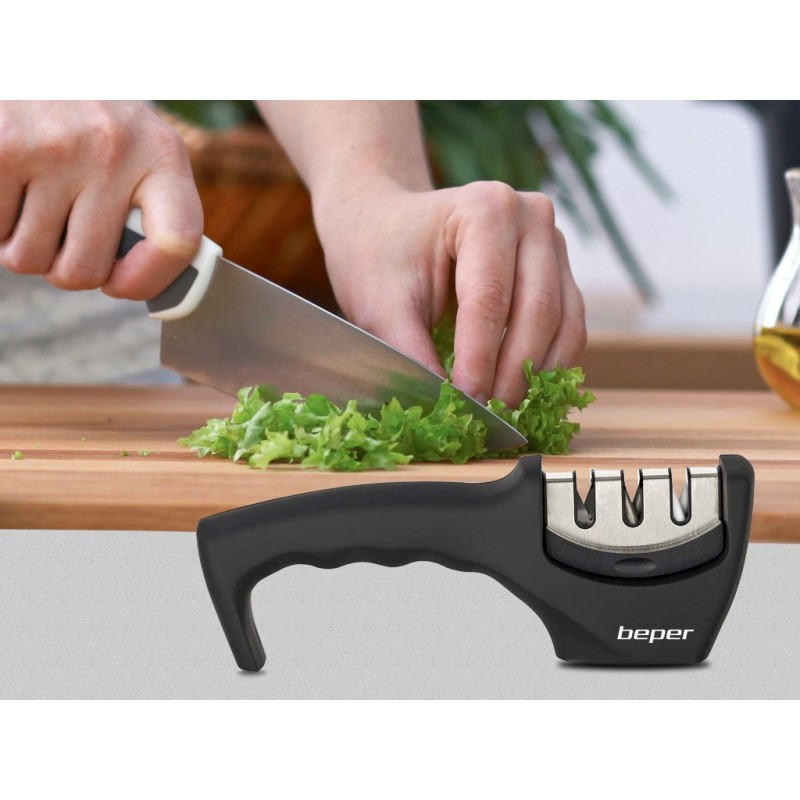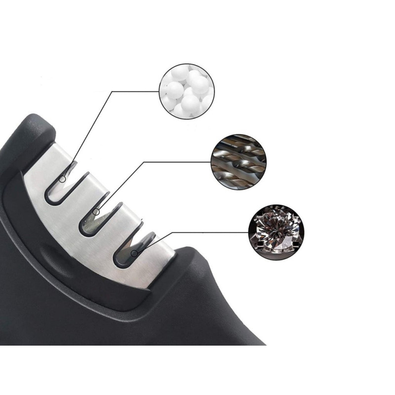 Handy knife sharpener ideal for sharpening kitchen and hunting knives. It is equipped with three sharpening slots: diamond slot for repairing blunt blades, tungsten slot for the real fine sharpening and ceramic discs to polish the blade. Non-slip base and ergonomic design for an easy and safe grip during use. Do not use with ceramic knives.