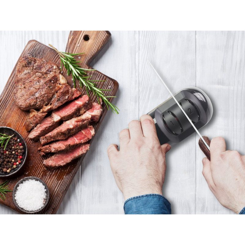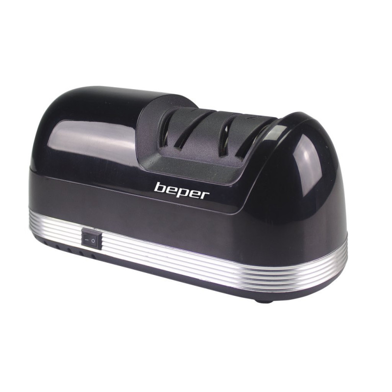 Electric knife sharpener for kitchen and multipurpose knives. Thanks to the durable diamond discs, sharpening is fast and precise. Equipped with many slots for sharpening the knives to the right angle. 2 stages of sharpening: rough and precision to smooth and polish the blades. Non-slip base for maximum stability and with a practical compartment with magnet to hold sharpening waste. Power switch for use in maximum safety.