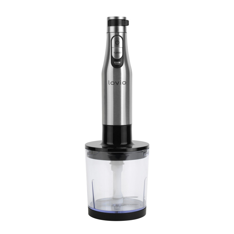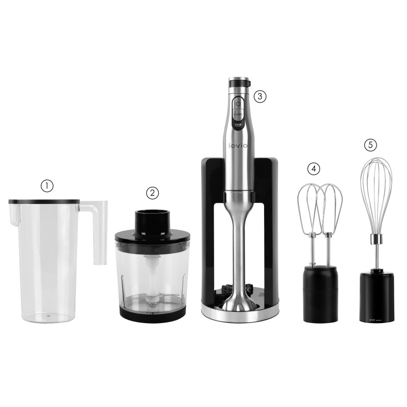 Included equipment: blending attachment, whisk attachment, food processor, container, lid, chopper, storage station/holder