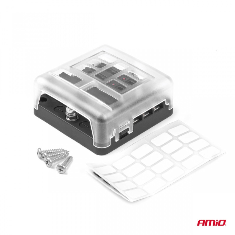 A universal 6-circuit fuse box with an additional ground rail. If a fuse blows, a red LED located next to each socket illuminates, allowing you to quickly and easily determine which circuit is at fault.