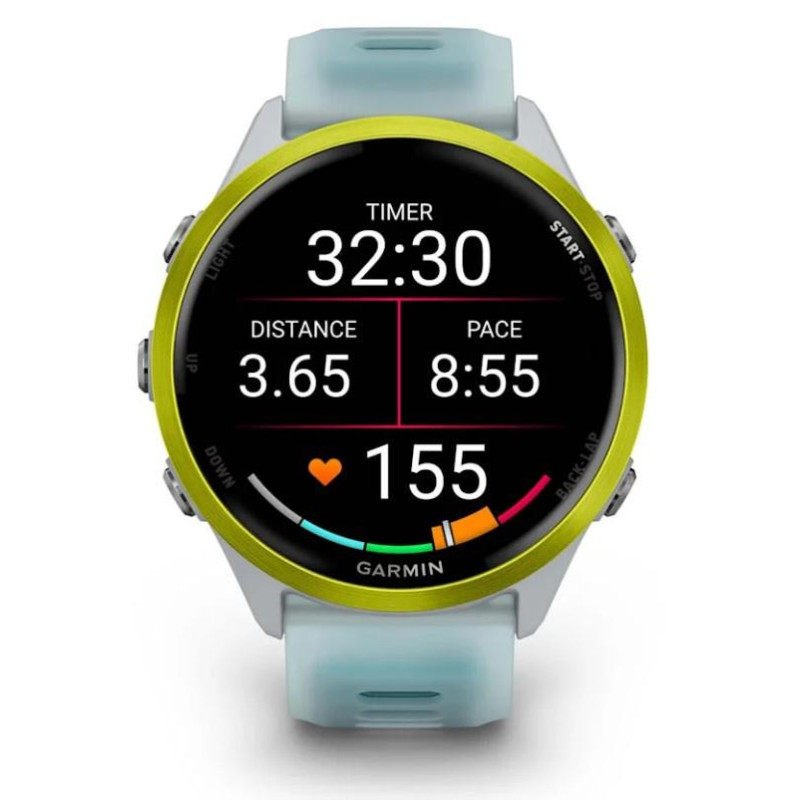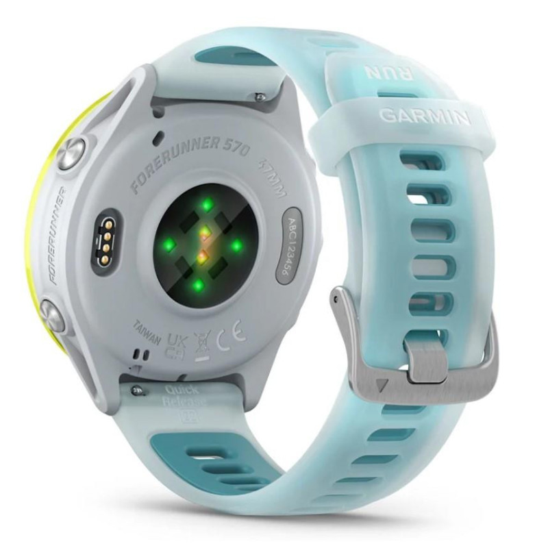 | Summary | Garmin Forerunner 570. Display diagonal: 3.56 cm (1.4"), Display technology: AMOLED, Display resolution: 454 x 454 pixels, Touchscreen. Flash memory: 8 GB. Wi-Fi. GPS (satellite). Weight: 50 g. Band material: Silicone, Band colour: Blue, White |