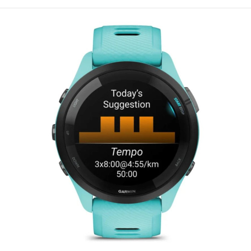 Features a vibrant AMOLED touchscreen, advanced training metrics, and supports Garmin Coach training plans.