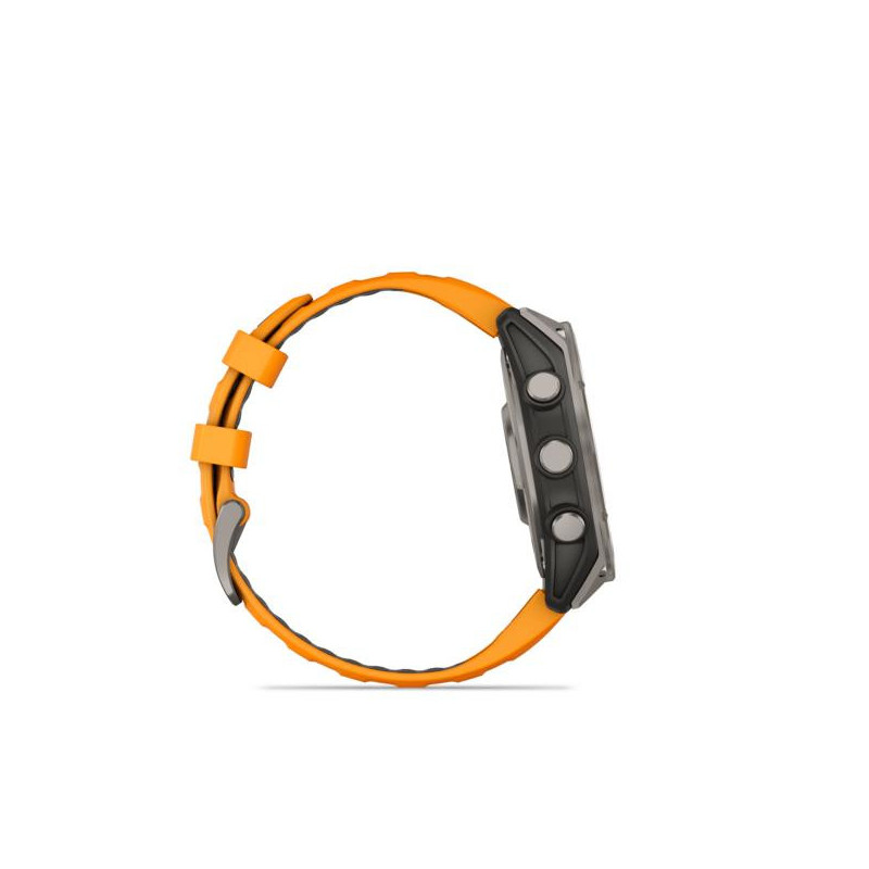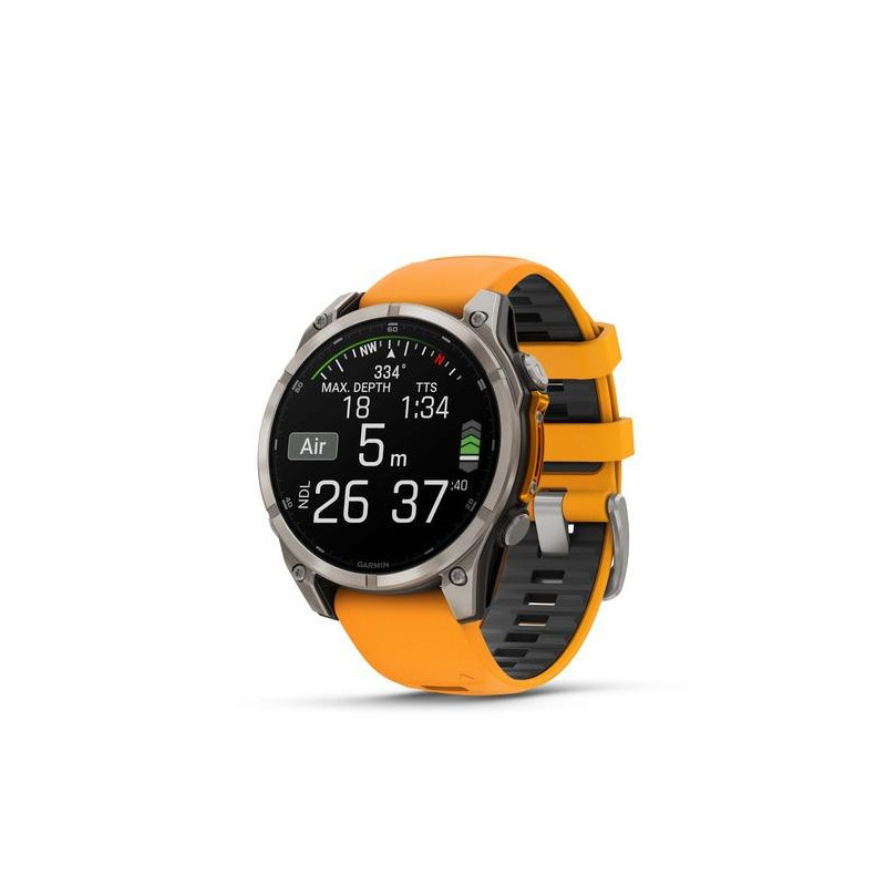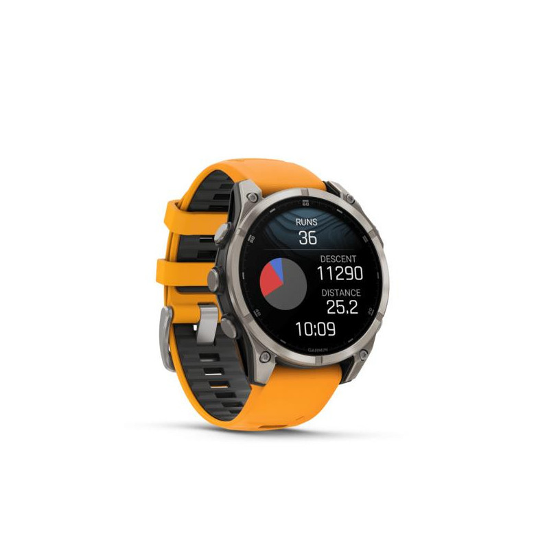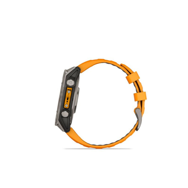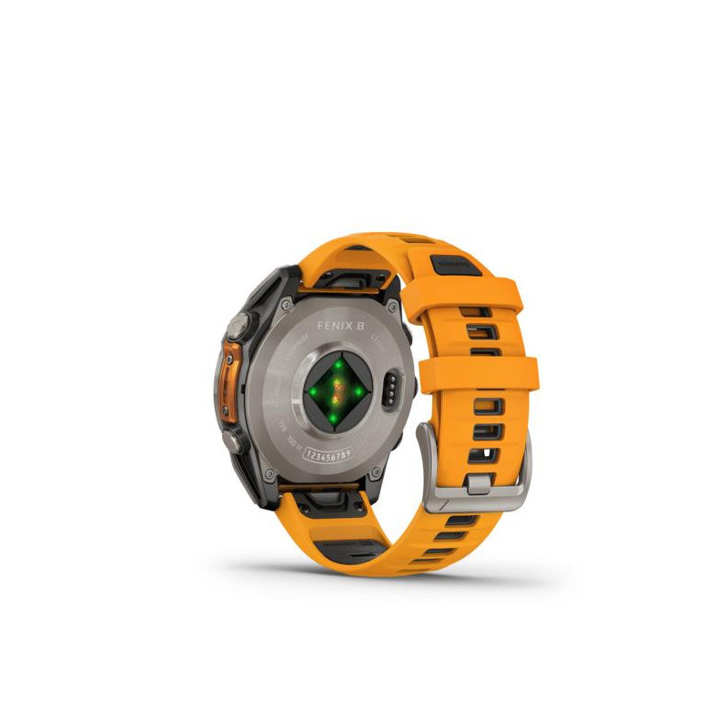 | Summary | Garmin fenix 8. Display diagonal: 3.56 cm (1.4"), Display technology: AMOLED, Display resolution: 454 x 454 pixels, Touchscreen. Flash memory: 32 GB. Wi-Fi. GPS (satellite). Waterproof up to: 40 m, Band material: Silicone, Band colour: Black, Orange, Band size: One Size |