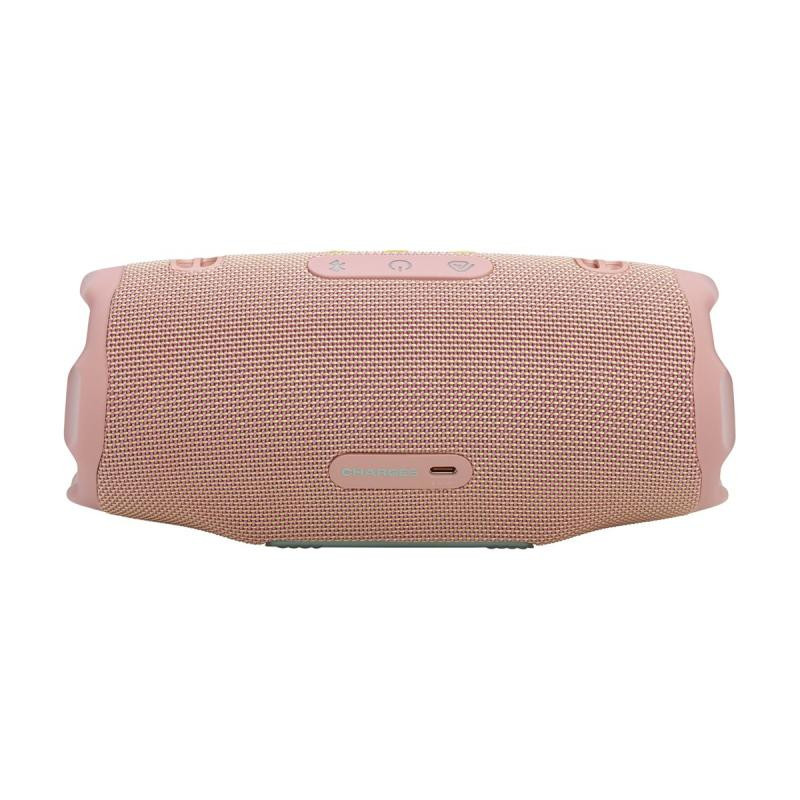 The JBL Charge 6 portable stereo speaker in pink delivers powerful sound quality with deep bass and clear highs. It has a water and dust resistant design, up to 28 hours of playtime, and a built-in power bank for charging devices.