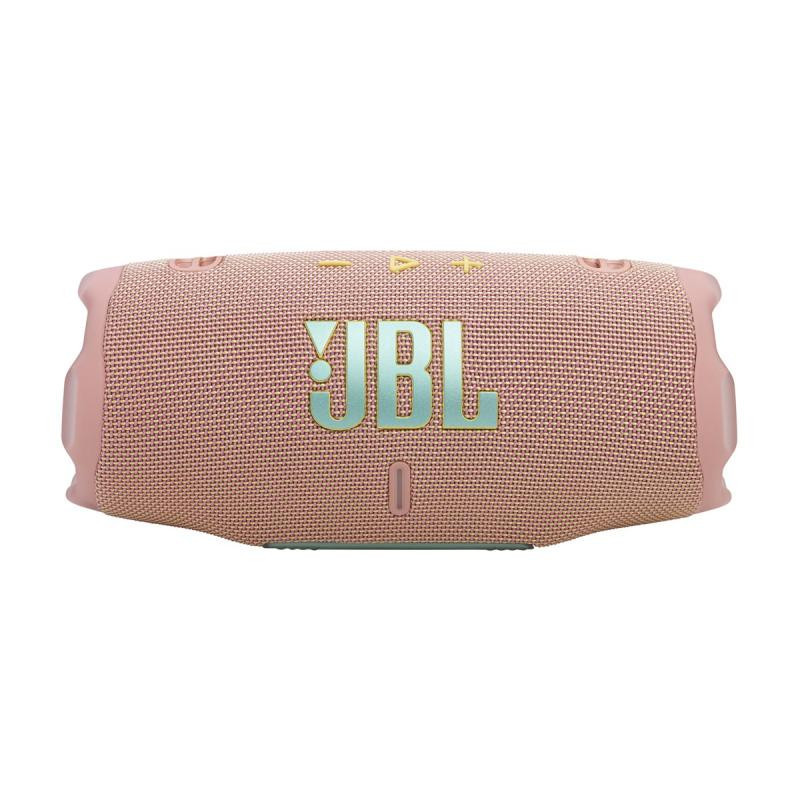 The JBL Charge 6 Portable Stereo Speaker in pink offers powerful sound quality with deep bass and clear highs. It has a water and dust resistant design, up to 28 hours of playtime and a built-in power bank for charging devices.